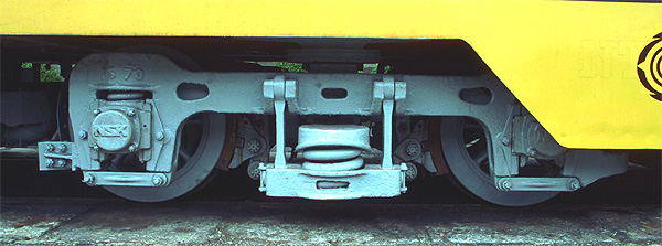 住友金属FS-70台車。側枠が鋳造品なので、肉抜き穴があるなど複雑な形状にも関わらずほぼ一体成型である。