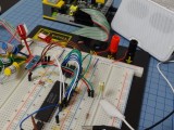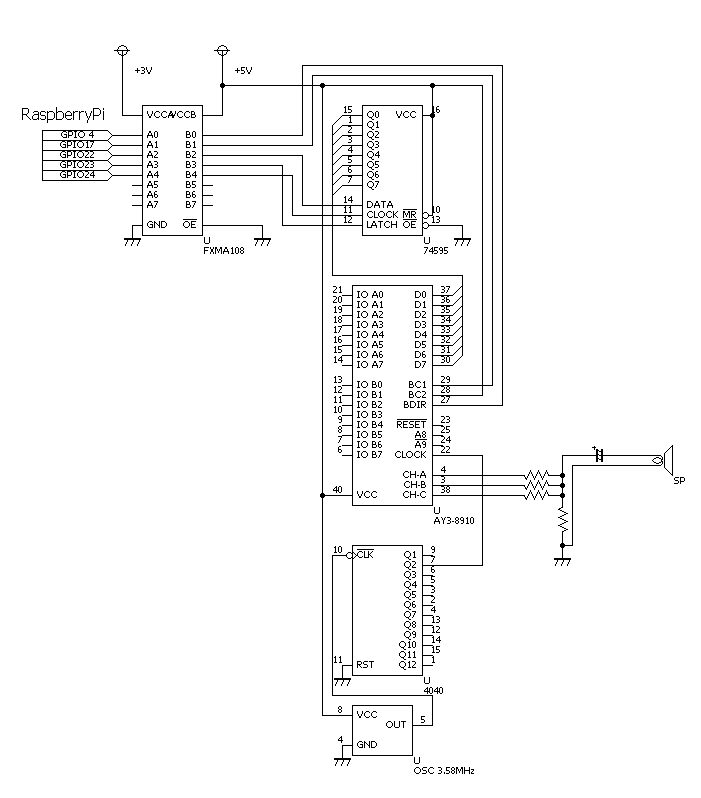 その辺の事情を踏まえて、データピン8bitはシリアルパラレル変換ICの74595を使うようにして、3本の線(DATA/CLOCK/LATCH)でシリアル信号をパラレル化8bitにする事にしました。これでFXMA108では、合計5本の信号を電圧変換すればよくなります。ただ、AY8910の出力をRasPiで受け取ることができない(AY8910のレジスタやI/Oを読み取れない)のですが、今回はRasPiからAY8910へ一方的にデータを送るだけなので問題ありません。