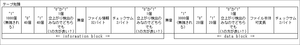 テープフォーマットは、大きく分けて、インフォメーションブロックとデータブロックに別れています。それぞれのブロックの先頭には、ブロック検出用のビット列があり、ブロック後方にはチェックサムがあります。