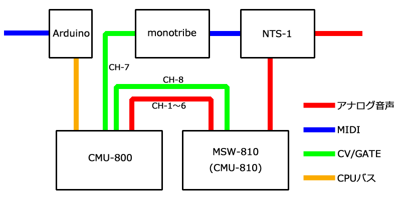 さらにその後、Michigan Synth Worksというベンダが何を思ったか(失礼)MSW-810という型番でCMU-810のクローン製品を発売すると知り、当時はフルキットのみだったので、キットなら安上がりだろうと購入に踏み切り苦労して組立てて調整までやり切ったおかげで念願のアナログシンセを入手することができました(なお費用は特に安上がりにはならなかった)。CMU-810(MSW-810)もまた外部音声入力とシンセ出力とのMIXERが搭載されてますので、CMU-800とまとめられることになります。アナログシンセなのでポルタメントのあるCH-8出力から接続することにします。