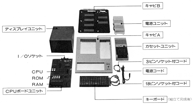 裏表紙というか、最後のページにてセミキットであることをイメージさせる構成写真がありますが、これは試作品の写真を流用したものだと思われます。もちろんデータレコーダ部のデザインや前面側の電源スイッチが削除されているなど製品仕様になっている部分もありますが、だいいち基板が試作品そのままですし、英数/カナLED近辺のデザインはやっぱり違います。