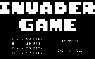 | タイトル画面でスペースキーを押すとスタート。 テンキーの4と6で左右に移動するのみ。攻撃はスペースキーで、発射モード(3発まで連射する)と停止状態を切り替える。なお連射状態にすると被弾してもゲームオーバーになってやり直しても連射状態が続く。 敵機は16種類あり、いろいろな場所から画面に現れて(ワープインするものもある)、いろいろな動きをしながら弾を発射したりする。この出現パターンが出尽くすとLOOPのカウンタが一つ増え、自機が一つ増え、難易度が上がる。5周目で最高難度になるとのこと。 タイトル画面で速度調整ができる(背景の星の数が増減する)。Sキーを押した後A(速い)~Z(遅い)を押すと26段階で設定する。 またタイトル画面でHキーを押すとHARDモードに、EキーでEASYモードになる。 Qを押すとプログラムが終了する。スコアなど画面上に現れる数値は16進数。 |