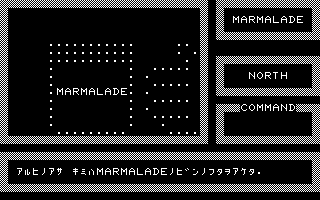 | タイトル画面からゲームオーバーまで、上下に分割された画面構成になっている。これは約2画面分の横長になっているフィールドの左半分が上側に、右半分が下側に表示されているという意味である。またメッセージは中央部に現れる。 タイトル画面(デモ画面になっている。キャラクタがちょこまかと動き、時々泥玉を投げる)で何かキーを押すとレギュラーとコンストラクションモードの選択に移る。ここではフィールドに山を作るところで、レギュラーはプリセットの山を選び、コンストラクションはエディットして山を作るという意味である。 レギュラーを選ぶと0から9までの数字とZキーの入力を促される。数字キーはそれぞれプリセットの山のパターンの番号を表しており、押すとそれぞれの形の山が現れる。 数字キーは一度押しただけでは画面上側にのみにしか山を作らない。そこでZキーを押すと下側の設定に切り替わり、また数字キーを押して山を作る。上と下で違う山の形にしても構わない。 山の形が決まったらリターンキーを押すと確認を求めてくるのでNキー以外を押すと確定する。 次にコンピュータのレベルを聞いてくるので1から5の数字で設定する。数字が大きいほど難しい。 ゲームが始まると先ほど作ったとおりの山に、上下それぞれ一人ずつのキャラクタが現れる。上側が人間側のキャラクタで、下側がコンピュータのものである。 キャラクタは4,6キーで左右に動き、Zキーで泥玉を取り、Xキーで右方向に投げる。 キャラクタは1/2段('ュ')までなら登ることができる。 泥玉は山から取るのだが、1/2段・1段('ヨ')と3/2段('ヨ'の上に'ュ'が載っている)のところからしか取れない。うっかり2段以上にしてしまうと、自力ではもう泥玉を取れなくなる。 泥玉を取った状態ではSTOCKのところに丸印が出る。この時もう一度Zキーを押すと泥玉をその場に置くことができる。これにより山の形を少しずつ変えて、バリケードを作ることも可能である。 泥玉を投げる時、Xキーの押した長さによって到達距離が変わる(長いほど遠くなる)。基準になるものはないので感覚で投げるしかない。 泥玉を持っている時に限り2キーでしゃがむことができる。ただし持っている泥玉がなくなるほか、短時間しかしゃがんでいられない。 泥玉を相手に8個先に当てた方の勝ち。山から残らず泥玉を取りきったり、取れない形になってゲームが進行できなくなったらGキーを押せばタイトル画面に戻る。 タイトル画面の次でコンストラクションモードを選んだ場合のキー操作は、4,6キーで左右の位置を選び8,2キーでその場所の泥の高さの変更である。上または下の画面の地面のところに'+'記号があり、これが編集ポイントとなる。リターンキーを押すと編集終了となる。 最初にレギュラーを選びプリセットの山を配置した後、確認を求めるステップでNキーを押すとレギュラーとコンストラクションの選択に戻るので、ここでコンストラクションを選ぶとその状態で山の編集が可能になる。 |